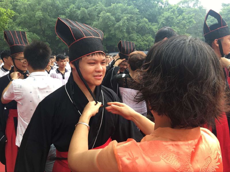 父母为孩子加“冠”。冠笄之礼,意在提示行礼者由毫无责任的“孺子”从此成为担当起家庭和社会责任的成年人。成人者加冠之后,已成君子。