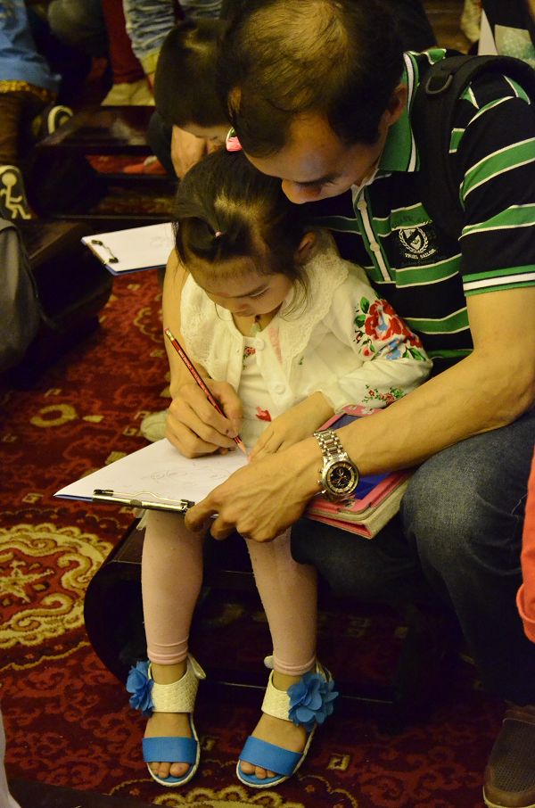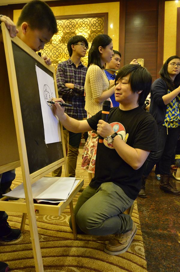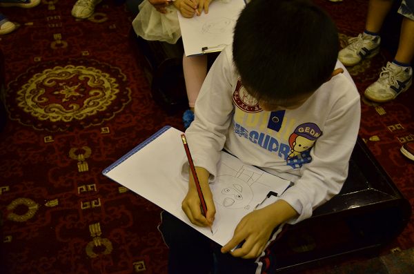 午饭后,神秘嘉宾——《喜洋洋和灰太狼》的作者黄伟明老师现身会场,带来了新作品《开心超人》的人偶与学子们拍照、玩乐,黄老师还现场授课绘画技巧,学子们的绘画天赋得到了老师的赞许。