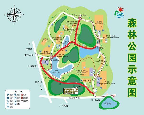 为保障园区的交通秩序和管理工作,确保游览登高安全,将对部分路段实施临时交通管制和分流措施,具体管制路段:环山路与纪元路路口往宣言广场方向实施管制、环山路与穿云路路口往宣言广场方向实施管制、彩云路与纪元路路口往宣言广场方向实施管制,因应特殊情况,步湖路东门往南门方向将可能禁止车辆行驶。市民可将车辆停放于南门停车场、纪元塔停车场、孔圣园停车场、大佛停车场、鳄鱼湖停车场,高峰时段进入的市民尽量将车辆停放于园区外的停车场,步行进入森林公园。届时,请广大市民游客听从现场民警和森林公园安保人员指挥。同时,呼吁市民文明出行,保持公园环境卫生,切勿携带火种进入林区。不便之处,敬请原谅。
