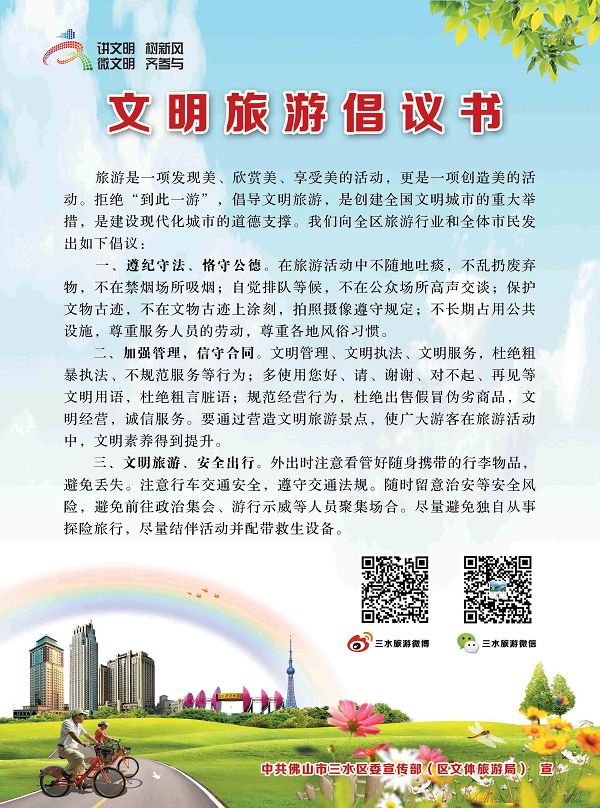 营造文明、和谐的旅游环境,关系到每位游客的切身利益。做文明游客是我们大家的义务,请遵守以下公约: