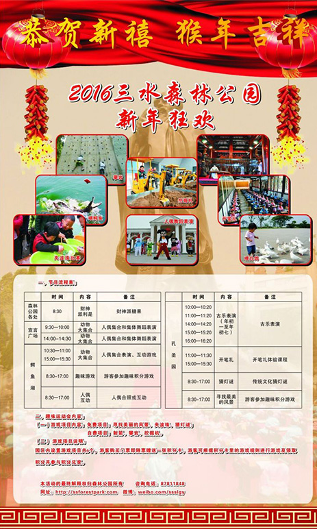 2016年农历新春佳节即将来临,为了丰富三水市民和各地游客的节日活动、营造热烈、喜庆、祥和的节日气氛,结合景区自身的特色将举行一系列游园活动。年初一至年初三举办 “2016森林公园新年狂欢节”活动。内容包括鳄鱼湖:卡通人偶互动表演、趣味游戏等内容;孔圣园:猜灯谜、儒家道德讲堂和古乐表演等。