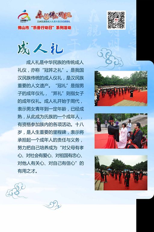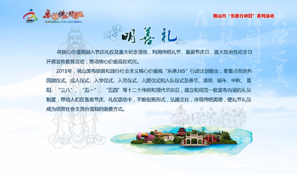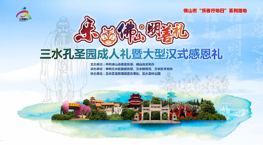 为了更好的践行社会主义核心价值观,传播乐善佛山践于礼的理念,9月7日将“乐善行动日”系列活动安排在三水孔圣园,以成人礼、感恩礼为主体活动,以传统和现代节庆日礼仪文化宣传为辅,使学生参与学习传统的礼仪,从中领悟尊师重孝等“善礼”。欢迎各大市民当天早上前来观礼!