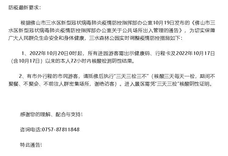 为积极配合开展大规模人员核酸检测工作,保障广大市民游客的生命健康安全,三水森林公园鳄鱼湖将作为核酸检测点,为防止人群聚集,造成交通阻塞,三水森林公园鳄鱼湖于2022年10月29日暂停对外开放一天。