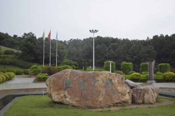 广场位于鸳鸯湖的中间,面山而建。广场占地70亩,包括宣言石、图腾柱、露天大型舞台、重阳古道、大面积园艺等,是一个集娱乐、集会、登高、休闲功能于一体的大型广场。舞台为欧式建筑风格,广场内有标志性的巨石——宣言石,它寓意一对情侣共同表达爱的宣言,从广义上说,也寓意森林公园的生态宣言、发展宣言。此外,广场内有图腾柱、大面积的园艺可供观赏。
