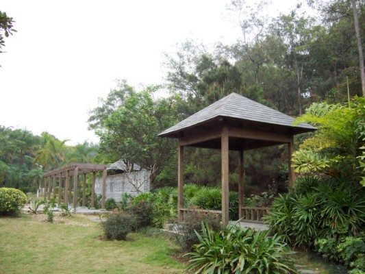 情人谷内有广东特色的玉堂春、印度垂榕、碧叶榕、花叶榕、高山杜鹃等乔木植物,这都是按照岭南园林的特色而建的。还有仿古的建设物——花架、小亭,情侣们在这里可以感受浪漫情怡。