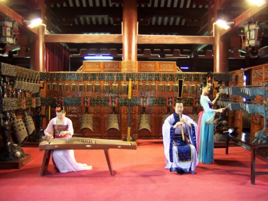 孔圣园崇圣祠三楼欣赏古乐演奏。远离尘嚣环境清幽,捧上一杯清茶,听着古筝、古编钟、古编磬奏上一曲《西宫词》或《高山流水》,该是何种享受。